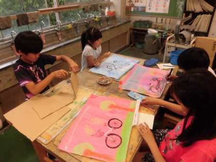 仕上がった子から、「デコボコ絵画」のために、段ボールを切りながらおもしろそうな形を見つけていました。切った形を組み合わせて、さらにおもしろい形を探していくみたいです。