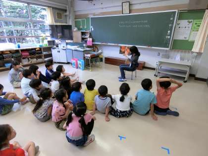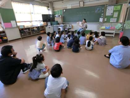 さわやかさを感じる気持ちのよい朝の時間帯に、楽しいお話を静かに聴き入っている子どもたちでした。