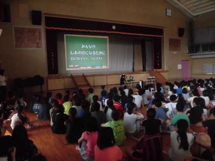 今日の児童集会では、4年生が総合的な学習の時間の学習で取り組んでいる「ハッピープロジェクト」から、目の教室の友達の紹介やインタビューを通して、学んだことを映像を通して紹介・発表しました。