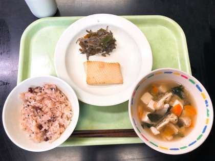 今日は笹原小学校の開校記念日です。そこで、今日は開校記念日お祝い給食にしました。日本では、赤い色は邪気をはらうと考えられており、成人式や出産祝い、入学祝いや七五三など、めでたいことがある日に赤い赤飯を食べる習慣がありました。今日は少し肌寒いので、ほかほかの赤飯やあたたかい汁を飲んで、体を冷やさないようにしましょう。