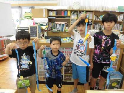 読み聞かせは、雨に関する「こりゃたいへん!!あまがえる先生 ミドリ池、きゅうしゅつ大作戦」で、みんな静かに聞いていました。工作は、雨のかざりです。たくさん作ってかざったら、雨の日も楽しくなりそうな素敵なかざりができました。