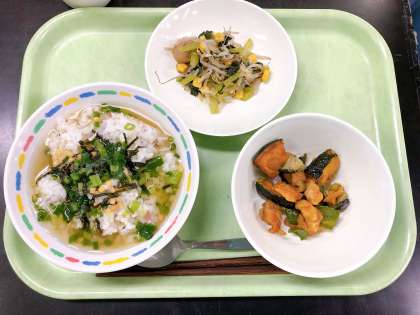今日は、暑くてジメジメしたときにも食べやすい、冷やし梅茶漬けにしました。お茶漬けはさらさらと食べられるので、疲れているときにもよいメニューです。しかし、食べやすいからとほとんど噛まずに飲み込んでしまうと消化に悪いので、なるべく噛むように心がけてください。毎日雨と暑い日が続いていて、疲れも出てきているとお思います。夏野菜と鶏の南蛮かけは、夏野菜や鶏肉、酢のパワーでみなさんの元気を回復してくれます。