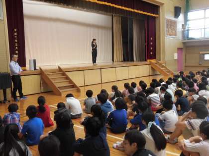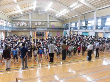 校長からは、「世界文化遺産として大阪府の『百舌鳥・古市古墳群』が登録されたこと」と今週のキーワードとして二十四節気の「小暑」(7日)と「大暑」(23日)について話をしました。