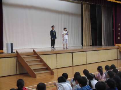 続いて、6年生の笹の子スピーチでは、「虹について」「本の作られ方について」をテーマに、2名が興味をもったこと、そして調べたことなどを順序よく発表し、自分の考えを述べることができ、大きな拍手を受けていました。