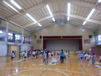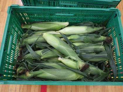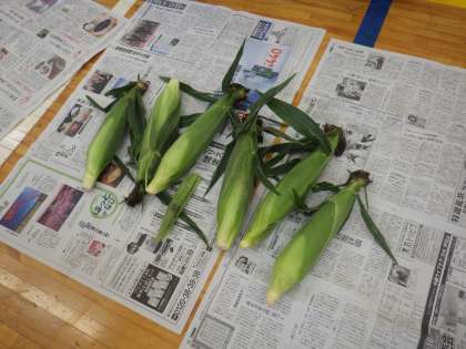 2年生は多目的室から体育館へ移動して、いよいよトウモロコシとご対面です。