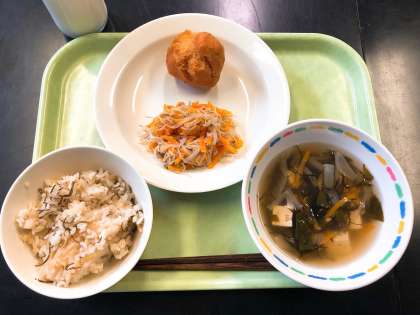 今日は、郷土料理給食で、沖縄県です。沖縄県は、日本の中でも南にあり、独特の食材や食文化があります。ししじゅうしぃは、豚肉やこんぶなどを使った炊き込みご飯のことです。じゅうしぃとは、沖縄の言葉で「雑炊」を意味しますg、炊き込みご飯のことも「じゅうしぃ」と呼ぶそうです。にんじんしりしりは、細く切ったにんじんをツナと炒めて卵でとじる料理です。今日はたまごは使っていませんが、にんじん嫌いでも食べやすいメニューです。沖縄県では、魚はあまり食べませんが海草をよく食べます。今日のスープは沖縄県産のもずくを使用しました。サーターアンダギーは、沖縄料理を代表するおやつですね。