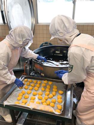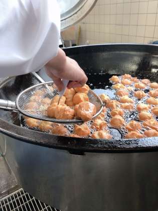 給食では手作りにこだわっていて、今日のサーターアンダギーも小麦粉と砂糖と卵をあわせるところから、すべて手作りです。できた生地をひとつひとつまるめて油で揚げる作業を約530個分繰り返しました。よい色にあがり、ぱっくりと表面が割れたら、しっかりと中心部の温度を確認して完成です。