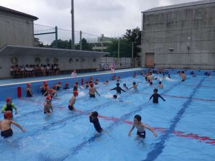 友達と水かけっこをしたり、プールの中でおにごっこをしたり、子どもたちは水泳の時間を楽しんでいました!