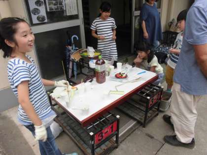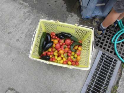 今日のささっちガーデンクラブがありました。草むしりなどのお世話をした後、講師の先生が持参された麦わらを切って作ったストロー(これが本物のストローですね)で麦茶を飲みました。様々な色に実ったトマトも食べました。とれたキュウリやナスに足を付けて、馬や牛を模したものを子どもたちは不思議そうに眺めていました。