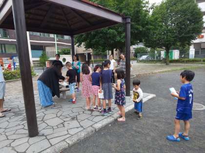子どもたちと保護者の方々が一緒にラジオ体操第一を行い、新しい1週間がスタートしました。参加スタンプを押してもらった子どもたちは、とても嬉しそうでした。