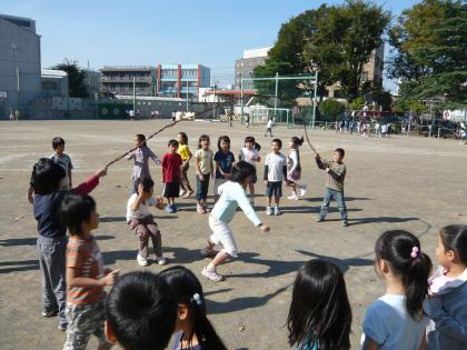 全校児童が、各クラスごとに長縄を回して5分間跳びました。1ヵ月前に跳んだときに比べ111回も増えたクラス、休み時間もストップウオッチを使って練習しているクラス、「ハイ、ハイ。」とかけ声をかけながら跳ぶクラス等、いろいろな取り組みがありました。今も休み時間になると長縄で遊んでいる姿が多くみられます。これからも続けて記録を伸ばしてほしいと思います。