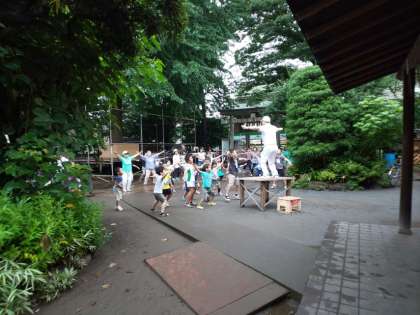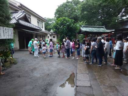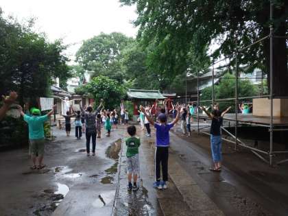 今日は、稲荷森稲荷神社で行われているラジオ体操会に参加しました。早朝の雨が心配されましたが、予定通り実施することができました。