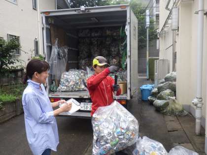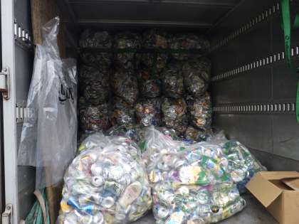 写真の右側→ 回収車に積み込まれた空き缶です。