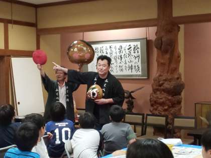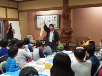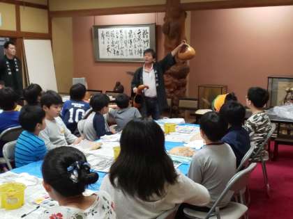 講師のふくべ洞の方々から、材料となる夕顔の実について、また、削ったものがかんぴょうとなること、内部をくり貫いたものを「ふくべ」と呼ぶことなど、教えていただきました。そして、下絵の描き方、色付け、完成までの手順を教えていただきました。