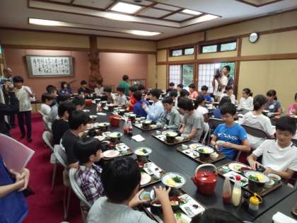 食事係のあいさつがあり、楽しく会話を交わしながら、食事を進めています。