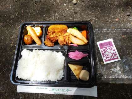 お弁当屋さんが運んで来てくださった、お弁当とお茶のペットボトルを受け取り、待ちに待ったお弁当タイムです。タイミングよく雨は止みました。たくさん歩き頑張って到着した甲斐があり、食欲旺盛です。残さずおいしくいただきました。