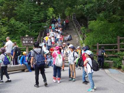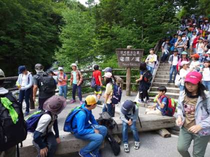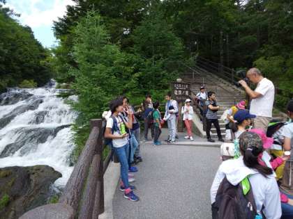 昼食のあと、ハイキングを再開し、竜頭の滝を上から下へ眺めながら、歩きました。途中で写真撮影もしながら、バスの待機場所のさかなと森の観察園駐車場に向かいました。