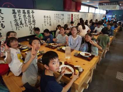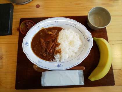 楽しみにしていたカレーライスとデザートのバナナに、笑顔がいっぱいです。涼しい食堂で、食欲も旺盛です。