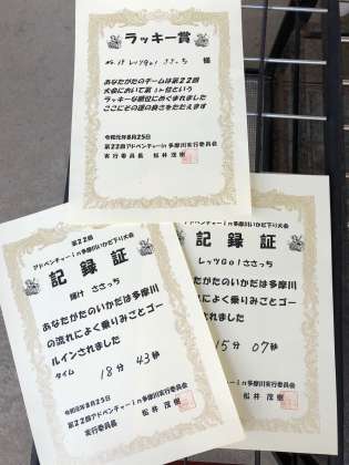 6年生の男子とお父さんの4名で構成した「輝け ささっち」、6年生と5年生の女子にお父さんの4名で構成した「レッツGo! ささっち」。共に多摩川の流れによく乗り見事にゴールすることができました。「レッツGo! ささっち」は、ラッキー賞を獲得しました。