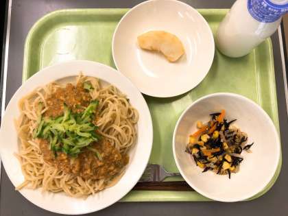 ジャージャー麺は、中華麺の上に甘辛い味付けの肉みそがのっている中華料理です。肉みそと麺がよくあっていて、食べやすい料理だと思います。中華サラダに入っているひじきは、苦手な人も多いと思いますが、がんばって挑戦してみてください。