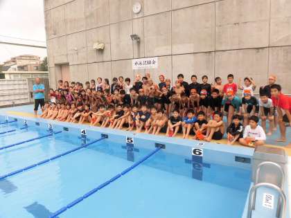 最後に全員で集合写真を撮影しました。やや緊張気味の雰囲気の中で始まった記録会でしたが、泳ぎ切った子どもたち、大きな声援や拍手を送った子どもたちからは、達成感を感じさせる笑顔がいっぱいでした。