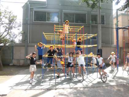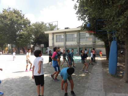 校舎内では、夏休みの自由研究の作品を見合ったり、校庭では友達や先生とバスケットボールやドッジボールを楽しんだり、固定遊具(ジャングルジム・滑り台・鉄棒)や一輪車で仲よく遊んだりするなど、友達とともに遊びを楽しむ姿がたくさんの見られました。