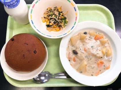 今日は、1学期に保健給食委員会が行った給食人気アンケートで、パン部門1位になったチョコチップパンです。チョコチップパンは給食に出る回数が少ないですが。大人気メニューの揚げパンを抑えて見事1位になりました。どのクラスも、とてもよく食べていました。