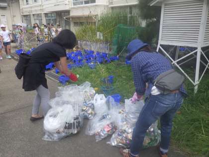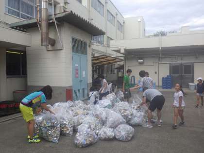 今朝、PTAのエコ委員会の皆さんが空き缶の回収作業をしてくださいました。