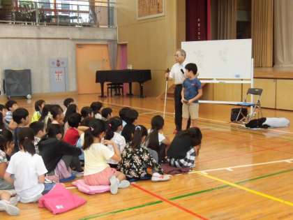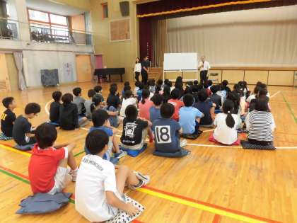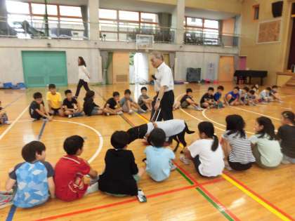 最初は、子どもたちが事前の学習で用意したたくさんの質問に答えていただきました。また、白状を使っている方への接し方や案内・誘導の仕方についても実技を交えて体験しました。最後には、一緒に参加した盲導犬「レビオ」の紹介と補助犬法についての説明を聞き、宮城さんとともに行動する盲導犬「レビオ」が一緒に歩行する様子を観察し、盲導犬・聴導犬・介助犬の役割について理解を深めることができました。