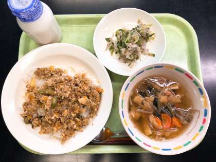 昨日は敬老の日でした。長年日本を支えてくれているご高齢者に、改めて感謝をする日です。自分たちも、将来健康で立派に年を取りたいですよね。今日はふつうのそぼろ丼ではなく、さばを使ったそぼろ丼にしました。さばには、血管がかたくなるのを防いだり、頭のはたらきをよくしてくれたりするよい油がたくさん入っています。肉だけでなく、魚もバランスよく食べるように心がけましょう。