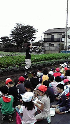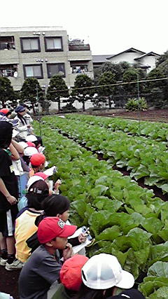 学区域にある河原さんの農園へ行き、お話を伺いました。畑の様子を見せていただき、栽培している野菜や育てるための苦労や工夫を教えていただきました。世田谷特産の大蔵大根を栽培している様子を見せていただき「種をうえてから3か月かかる。すぐには大きくならないんだよ。」と教えていただきました。