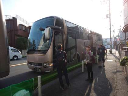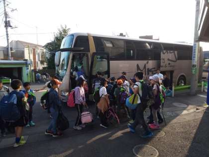 秋晴れの天気に恵まれ、2台のバスに分乗して、学校の東門前を7時36分に出発しました。