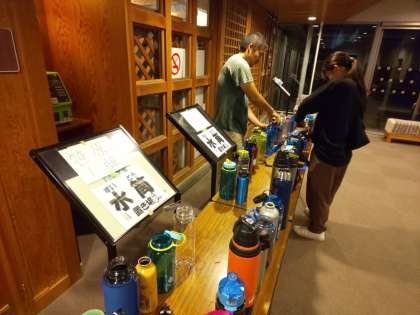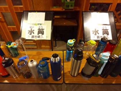 補助員さんたちは、飯ごう炊さんを終えて子どもたちが片付けたあとの炊事場の整理を終えて、今、子どもたちの水筒への給茶作業をしています。