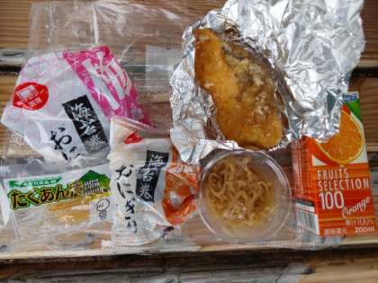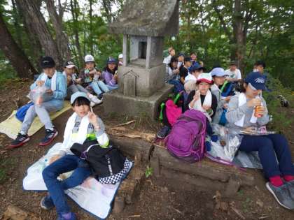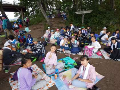 早速、楽しみなお弁当の時間です。山頂からの景色を眺めながら、友達と楽しく会話を弾ませ、宿舎で受け取ったお弁当を食べています。