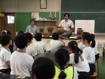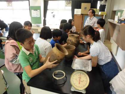 本日6年生は「郷土歴史文化特別授業」を行いました。2校時に2組、3校時に1組が学習しました。実際に縄文土器や弥生土器に見たり触れたりしながら、体験的に学習しました。また、食材加工の石皿や磨石、狩猟に使う石器など、各種生活用具についても見たり触れたりしました。講師の先生の話を聞き、実際に使われていた道具に触れることを通して、当時の生活の様子を想像することができました。本日持ってきていただいた石器や土器は、世田谷から出土したもので、子どもたちは身近に感じるとともに、驚きを感じました。