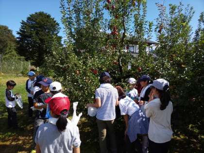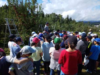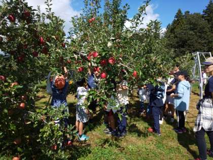 宮田さんからもぎ方を教えていただき、早速、一人ひとりが「あかぎ」という品種のりんごをもぎました。