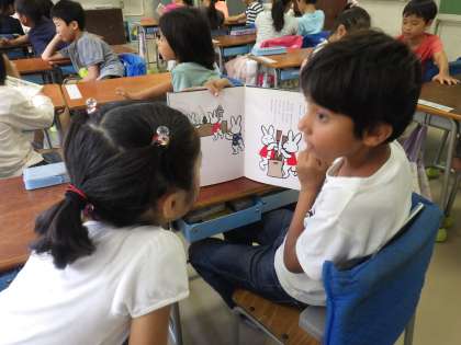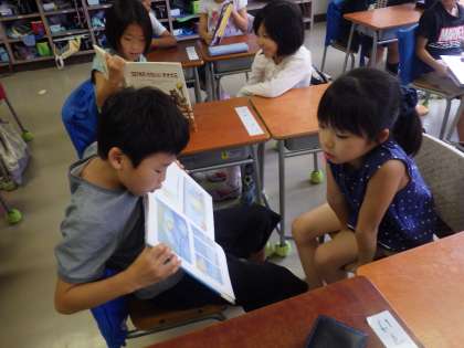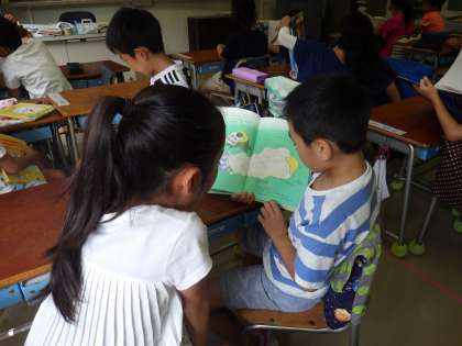 さっそく2年生どうしで、読み聞かせの練習を始めました!