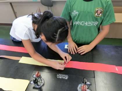 理科室では、はさみで紙を細長く切り、物差しなどを使わずに3mの「へび」を作りました。どの班が一番3mに近く作れるか?知恵を出し合って工夫していました。
