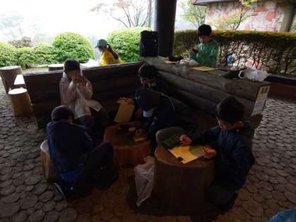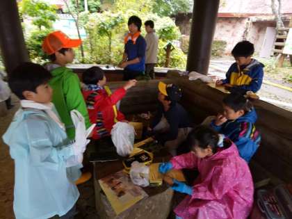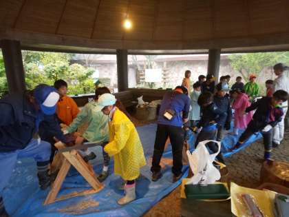 ヒノキやスギの丸太切り体験の様子です。のこぎりを上手に使って切り終えると、香りのする年輪がはっきりした木製コースターができ上がりました。