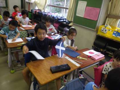 2年生の子どもたちは国際理解教育の一環として、日本vsスコットランドの一戦に合わせて両チームの旗を作りました。旗を振りながらテレビ観戦するのもいいですね。