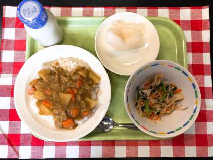 今日は、1学期に保健給食委員会がとった給食人気アンケートで主食部門1位になったカレーライスです。給食のカレーは、ふつうだったらスーパーマーケットで買うカレールーも位置から手作りして、心をこめて作っています。カレーライスのほかには、旬のきのこやなしもあるので、秋を感じながら食べてください。