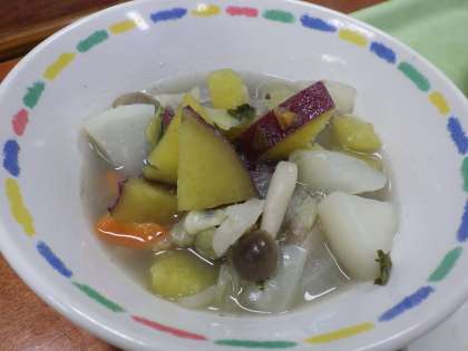 確かに今日のポトフはサツマイモの紫色と黄色、ニンジンのオレンジ色、かぶの白、しめじの茶色など、秋を感じさせる色がお椀につまっていました。
