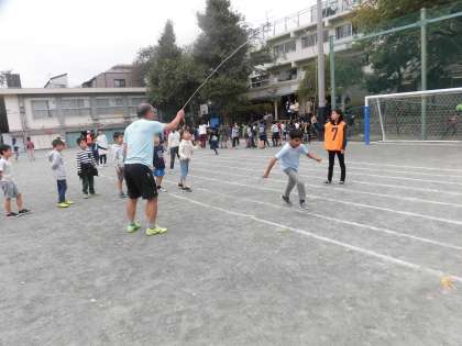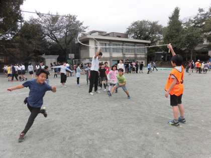 長縄跳び集会を受けて、中休みを中心に、全校で長縄跳びを楽しみます。1年生も、運動委員会のお兄さんやお姉さんが回し手を務める中、上手に8の字跳びをみんなで楽しんでいました。