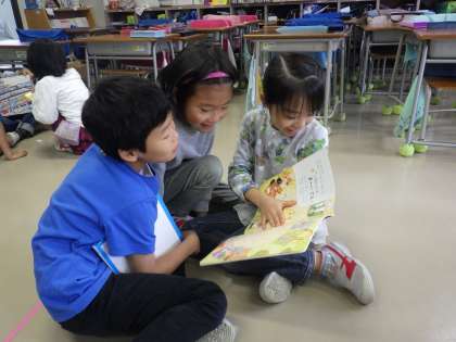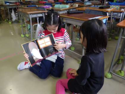 いま2年生は、学級の友達を幼稚園児に見立てて読み聞かせの練習をしています。