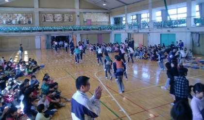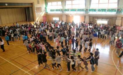 4月6日に入学した1年生と上級生との初めての顔合わせをした1年生を迎える会。初め緊張気味だった1年生も、上級生とのジャンケン列車で大喜び。長い列ができ、笹の子が1つになりました。最後は、6年生におんぶしてもらって退場、1年生はみんな笑顔満面でとても嬉しそうでした。
