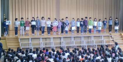 今年度、初めての児童集会は、前期委員会と代表委員会の紹介でした。委員会発表では、各委員会の委員長が活動内容を発表し、5,6年の委員を紹介しました。また、4年から6年の代表委員、各クラス4人が舞台横に並び自己紹介しました。一人ひとりの瞳から、笹原小を明るくするために頑張るぞという意欲が見られました。