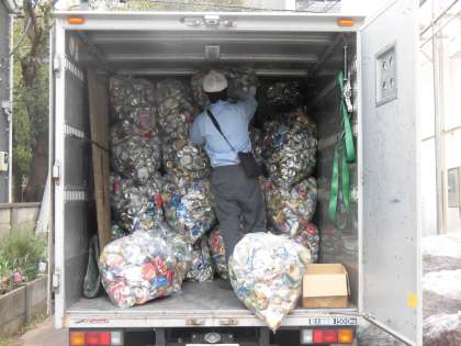 今朝は8時50分にトラックが到着し、整理されたアルミ缶回収袋が一袋ずつ回収業者によって計量され、総量を確認し、引き取っていただきました。