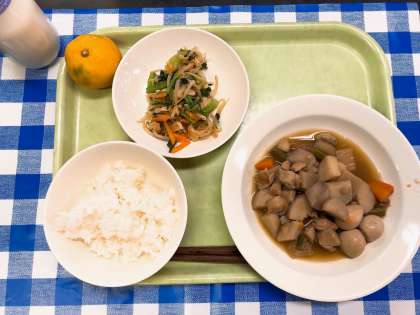 さといもはいもの種類の一つですが、じゃがいもやさつまいものほうが好きという人が多いと思います。しかし、さといもは他のいもに負けないくらいのすごいパワーをもっています。さといもは加熱すると消化しやすく、たんぱく質、ビタミンなどの栄養が豊富です、いものなかではカロリーも低く、食物繊維が多いのでおなかの調子をよくしてくれます、また、さといもは少しぬるぬるしていますが、このぬるぬるは免疫力を高めてくれます。なにより、秋の味覚でホクホクしていておいしいので、ぜひたくさん食べてください。