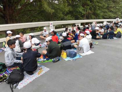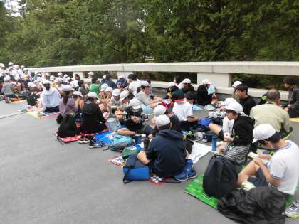 会場に到着し、午後の部の開始に向けて、陸上競技場のコンコースで、お弁当を食べました。競技場内では午前の部の競技が行われていて、場内アナウンスを聞きながら、また、コンコースを通っている時に目に入ったとても広い競技場の様子を想像しながら、おいしいお弁当を食べ、エネルギーを蓄えました。会話もたくさん弾み、緊張感も和らいでいる様子でした。
