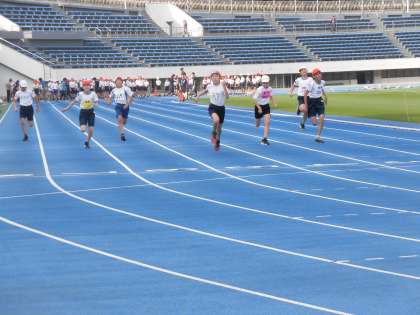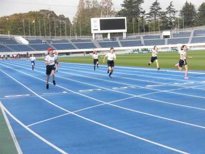 進行の都合でエンジョイランニングを行わず、女子の部・男子の部の順で、100m走・50mハードル走・走り高跳び・走り幅跳びの個人種目が行われました。また、男子の部のあとに、学校対抗の400mリレーが行われました。